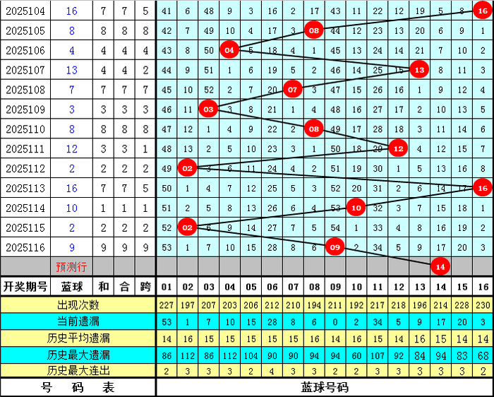 蓝球分析(界说:01-04为一区,05-08为二区,09-12为三区,13-16为四区):上期蓝球开出三区号码09,最近10期蓝球四区落号比为3:2:3:2,总体上各区蓝球走势基本均衡,本期蓝球看好在第四区开出,独蓝参考14。