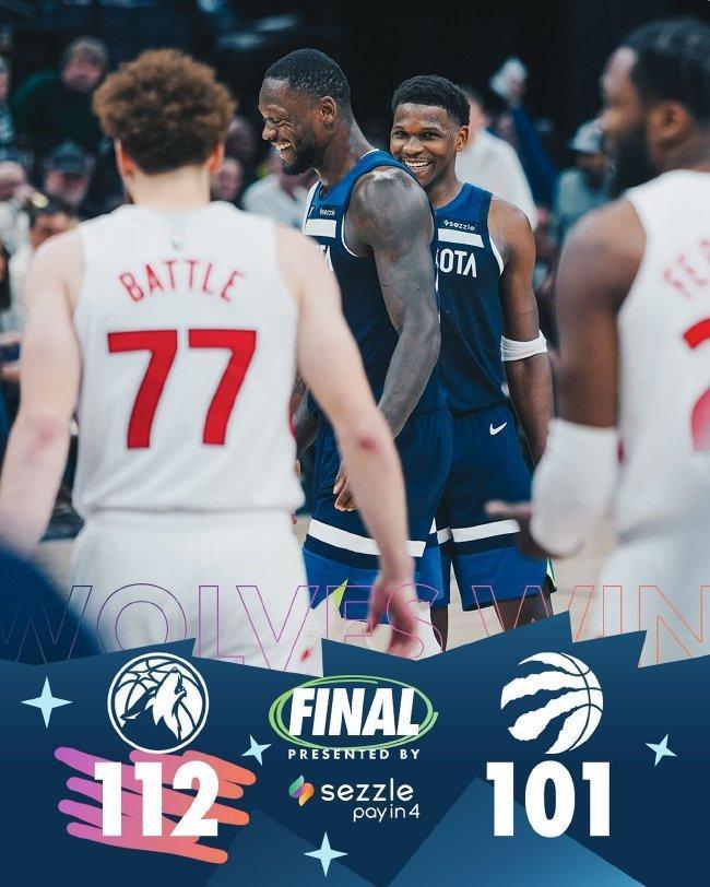 丛林狼(2-1):兰德尔24分9篮板5助攻、爱德华兹24分6篮板4助攻、迪文琴佐16分、戈贝尔15分13篮板、康利10分6助攻、里德10分4篮板